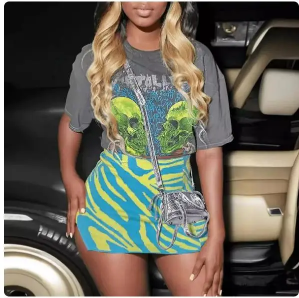 2 Piece Skirt Sets Sexy Crop Graphic Tee Tops Outfit Y2K Streetwear Fashion Mini Dress Sexy Chic Two Piece Set